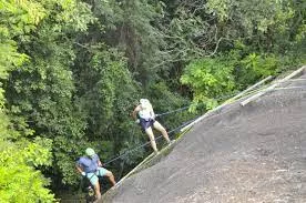 Aqui, o visitante é colocado em um equipamento que permite andar de frente na rocha e chegar até a beirada da pedra. As cordas são presas no equipamento, nas costas do praticante, seguindo todas as normas de segurança para atividades de aventura.